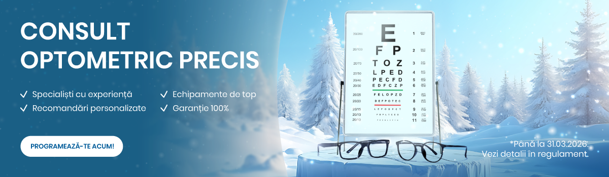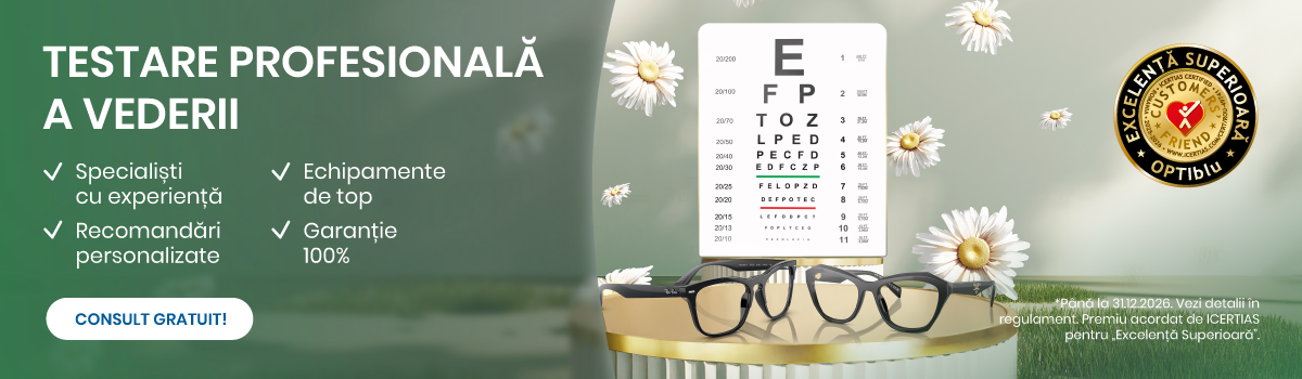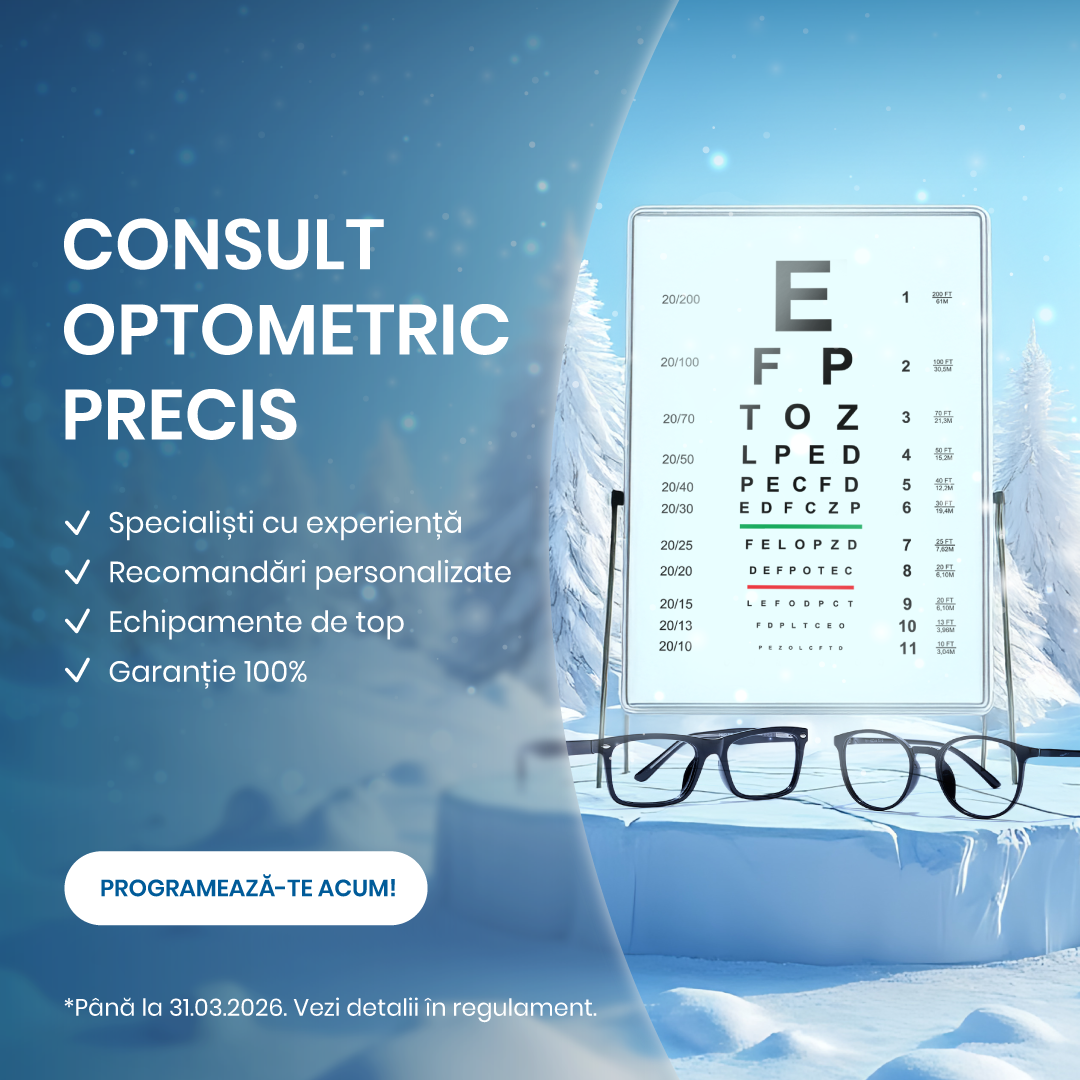 Consultatia de specialitate, efectuata cu aparatura computerizata de ultima generatie, determina cu precizie dioptriile potrivite si include prescrierea ochelarilor. Noi ne straduim sa fim mereu la cel mai inalt nivel de profesionalism si sa iti oferim solutii optice inovatoare, astfel incat tu sa te bucuri de o vedere sanatoasa si clara in fiecare zi.